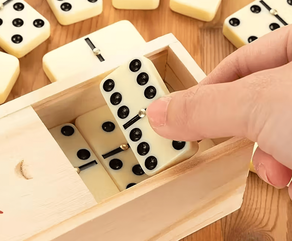 Klasisks 28 gabalu Domino komplekts koka kastē 2–4 spēlētājiem.